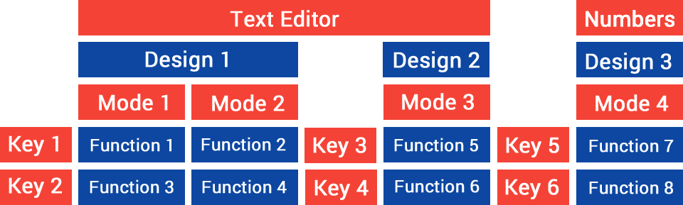 In order to keep the design of complex keyboards as simple as possible, the structure is mapped using the four terms design, mode, key and function. The graphic illustrates it.