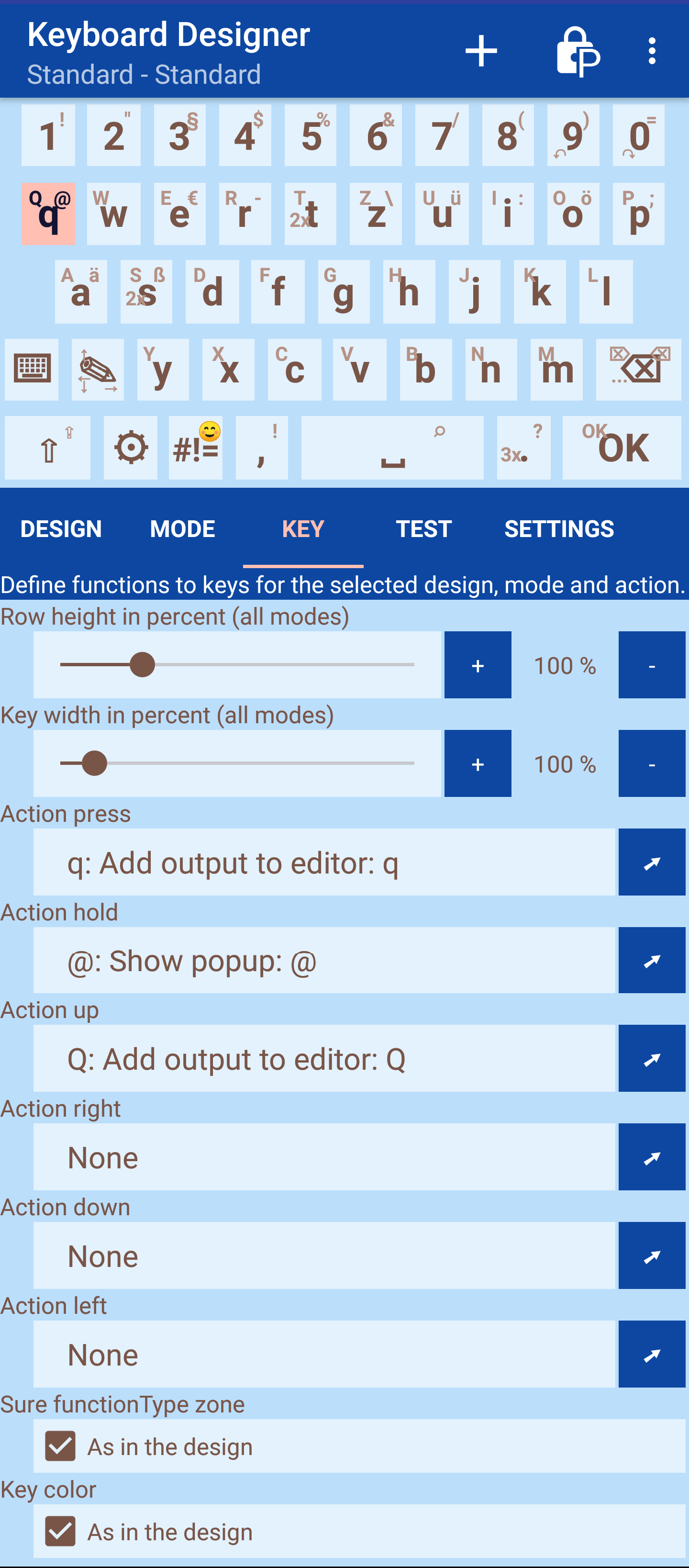 The width and height of a key can be defined. Changes are immediately displayed in the keyboard preview. To assign a function to one of the six actions, it is selected. The function dialog opens, whose description can be found here.
