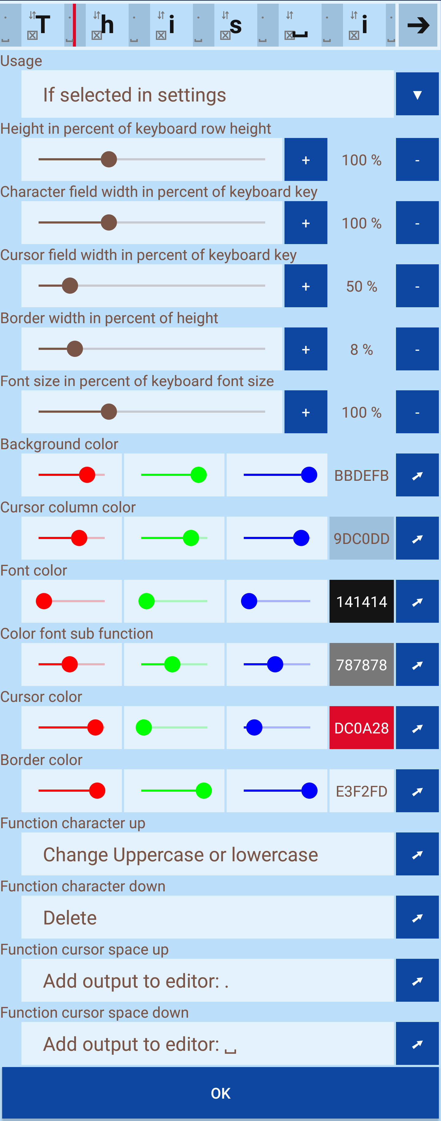 The magnifying glass is composed of the two alternating columns for the cursor and for characters. The widths of the columns and the font sizes can be determined in each case. The colors are adjustable. The height is given as a percentage of the keyboard's line height.